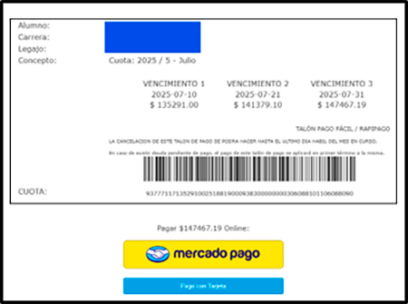 Opción para abonar la cuota mensual hasta el 3° vencimiento. Es importante contar con la factura o talón de pago. También disponible escaneado el código de barras de la factura, desde la aplicación de Mercado Pago.